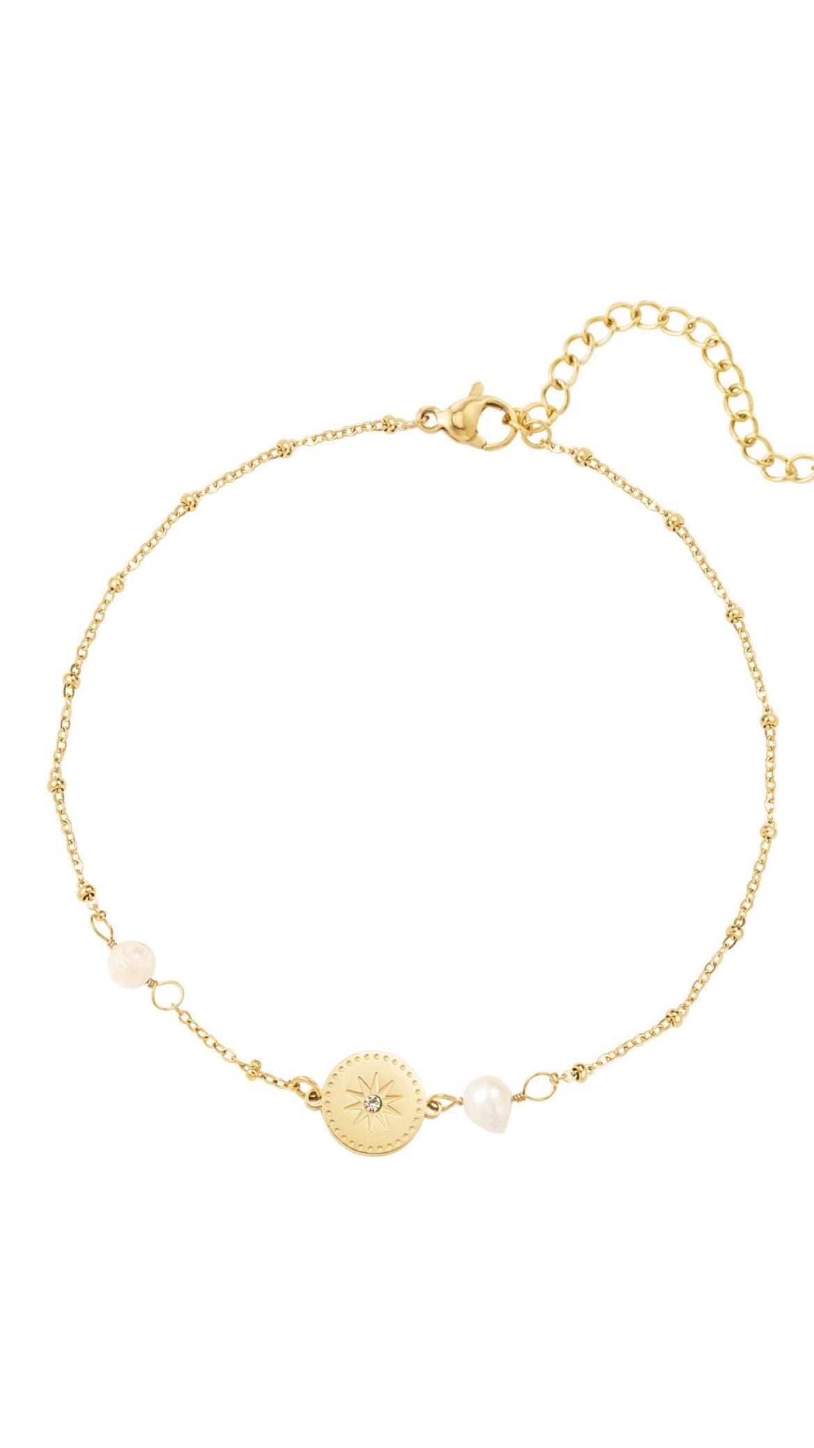 Ankelkæde med en fin guldplade med en zirkon i og perler